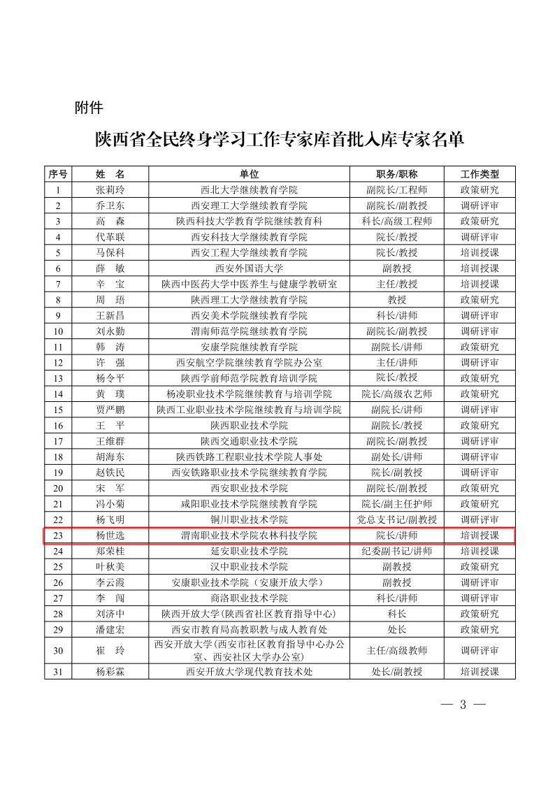 根据《陕西省教育厅办公室关于公布陕西省全民终身学习工作专家库首批入库专家名单的通知》(陕教职办〔2022〕21 号),农林科技学院院长杨世选成功入选全民终身学习工作专家库首批入库专家。